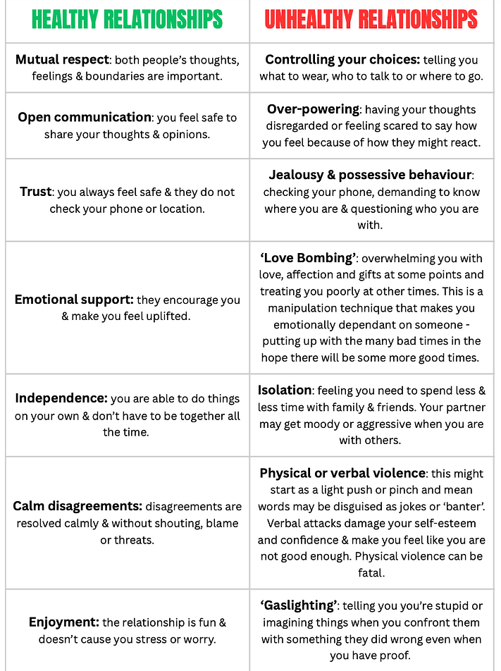 The relationships that we have with other people form some of the most important parts of life. Any type of relationship can be tricky and it is normal for people to have different opinions and sometimes disagree, but no relationship should make you feel sad more than happy and you should never feel scared.